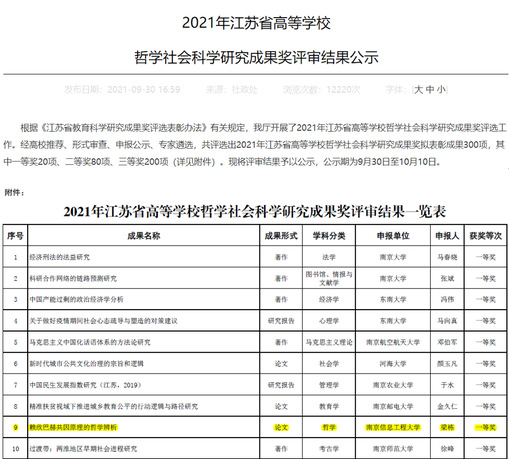 据悉,“江苏高校哲学社会科学研究成果奖“是由省教育厅主办,两年评定一次。此次我校共有10位教师获奖,其中一等奖1名、二等奖2名、三等奖7名。另外,“江苏省教育研究成果奖”也正在公式之中,我校教师拟获奖项涉及二等奖一项,三等奖两项。