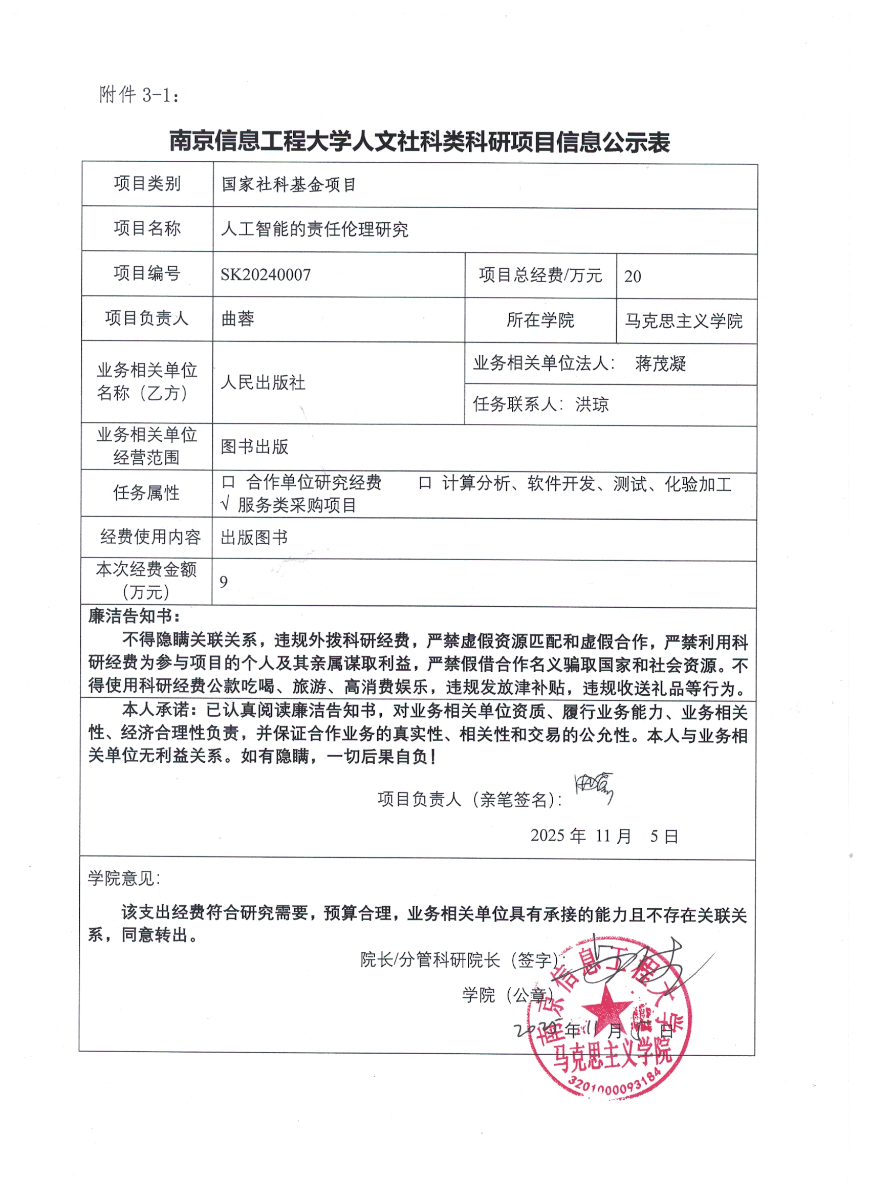 根据《南京信息工程大学科研经费管理办法(试行)》《南京信息工程大学人文社科类纵向科研项目经费管理办法》《南京信息工程大学人文社科类横向科研项目经费管理办法》相关规定,现对马克思主义学院曲蓉同志使用科研经费进行的服务采购类项目情况进行公示,公示时间为:2025年11月6日-2025年11月12日(公示时间不少于5个工作日)。